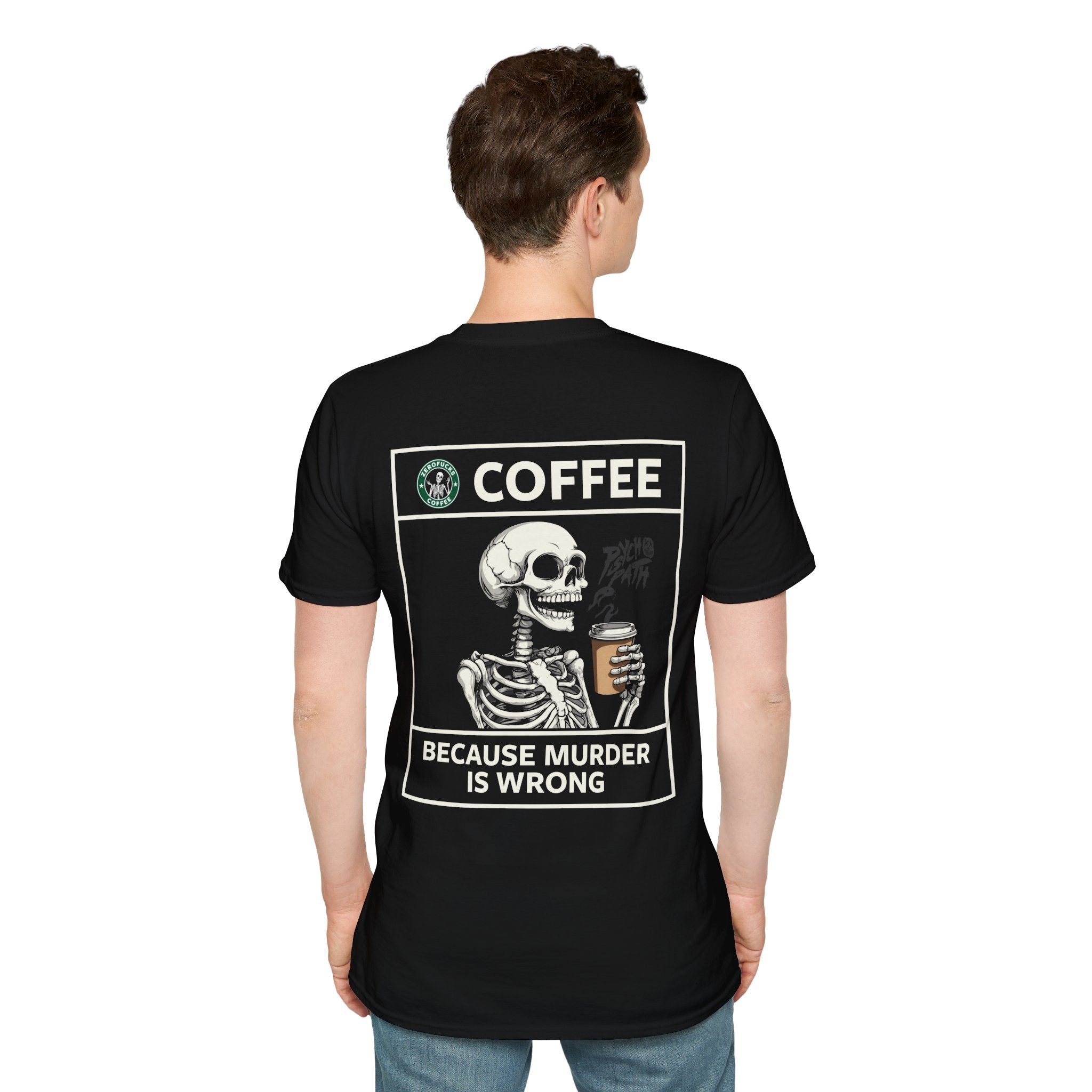 Sleep-deprived and dead inside? Same. This skeletal caffeine addict knows coffee is the only thing standing between you and a murder charge. Featuring branding from the unapologetic 'ZEROFUCKS' coffee co. – because you like your brew strong and your morals... flexible.