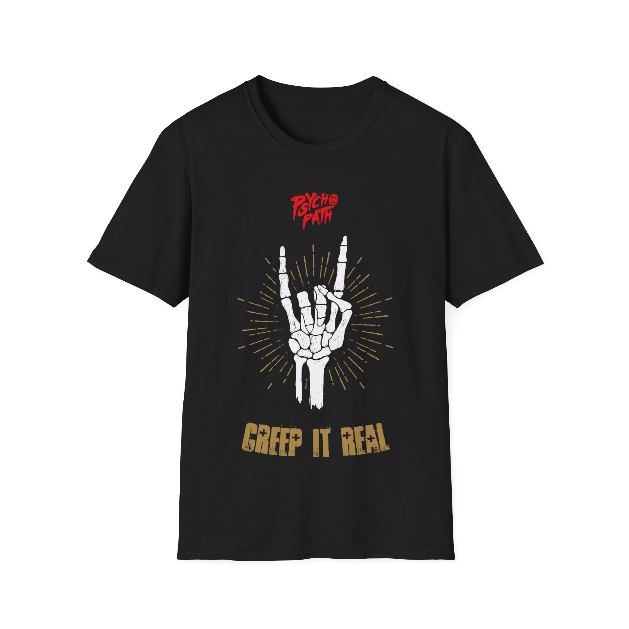 Throw up the horns and keep your horror cred intact. This tee’s got a skeleton hand flashing the rock symbol and a pun that hits harder than a haunted mosh pit. “Creep It Real” or don’t creep at all.