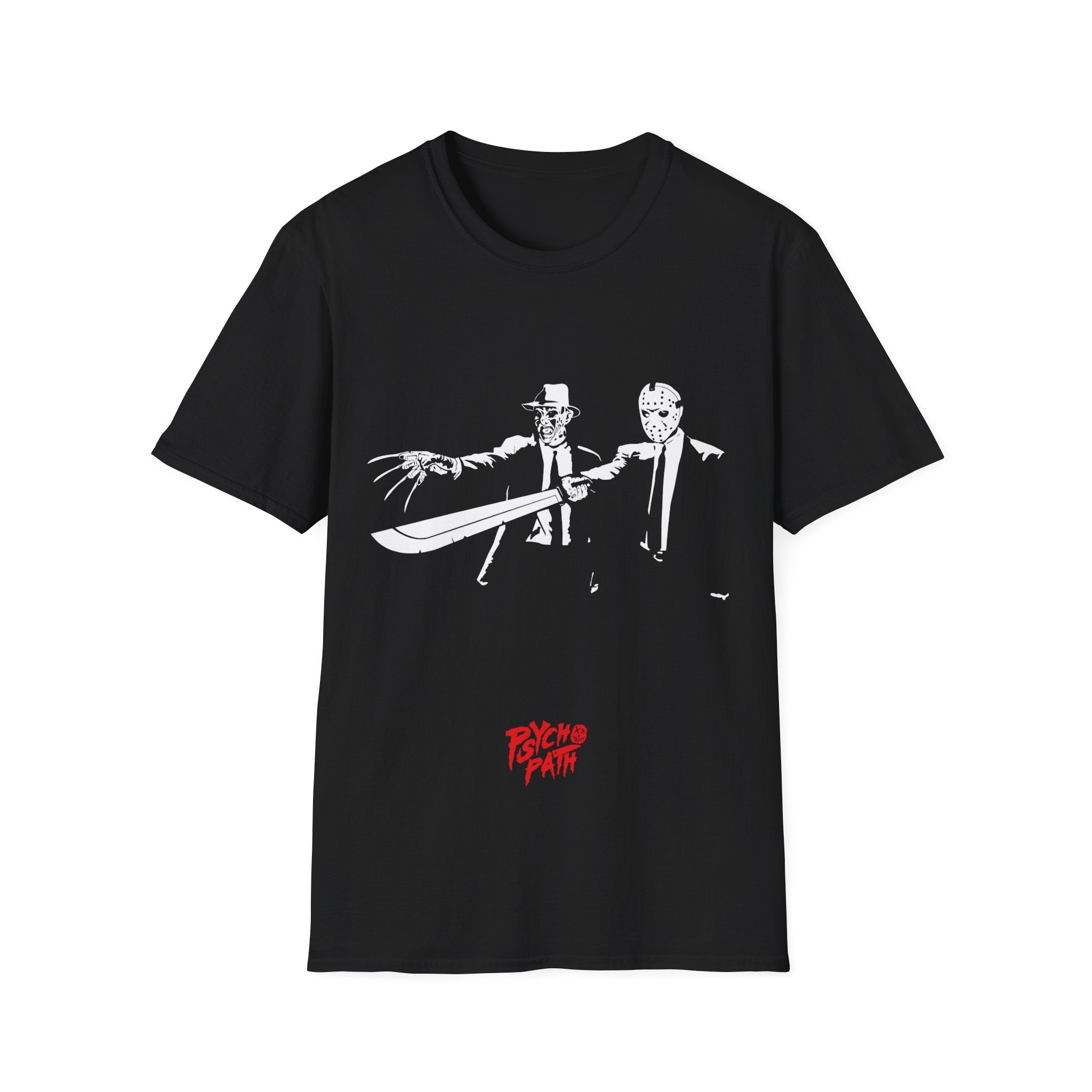 Two horror legends crash the Tarantino universe in this crossover tee straight from your darkest fever dream. Freddy and Jason channel their inner Vincent & Jules, suited up and ready to slash—er, philosophize. Cult cinema just got bloodier.