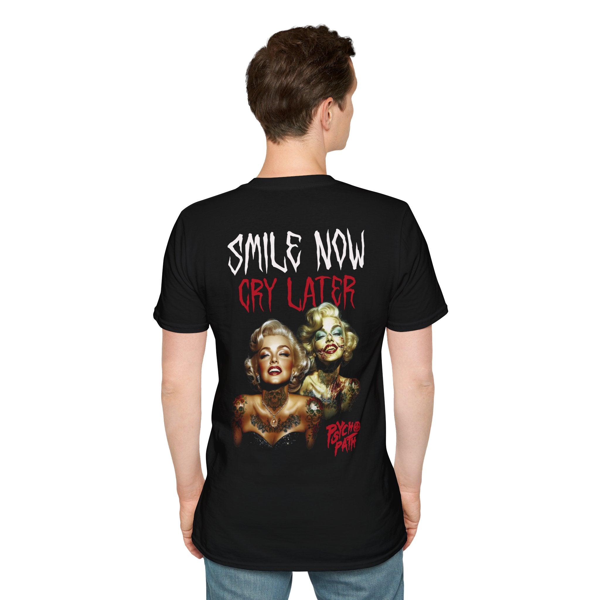 This striking tee features the iconic Marilyn Monroe like you've never seen her before—half radiant starlet, half decaying nightmare. With bold text reading “Smile Now, Cry Later,” it’s a chilling reminder that beauty fades… but horror lasts forever.