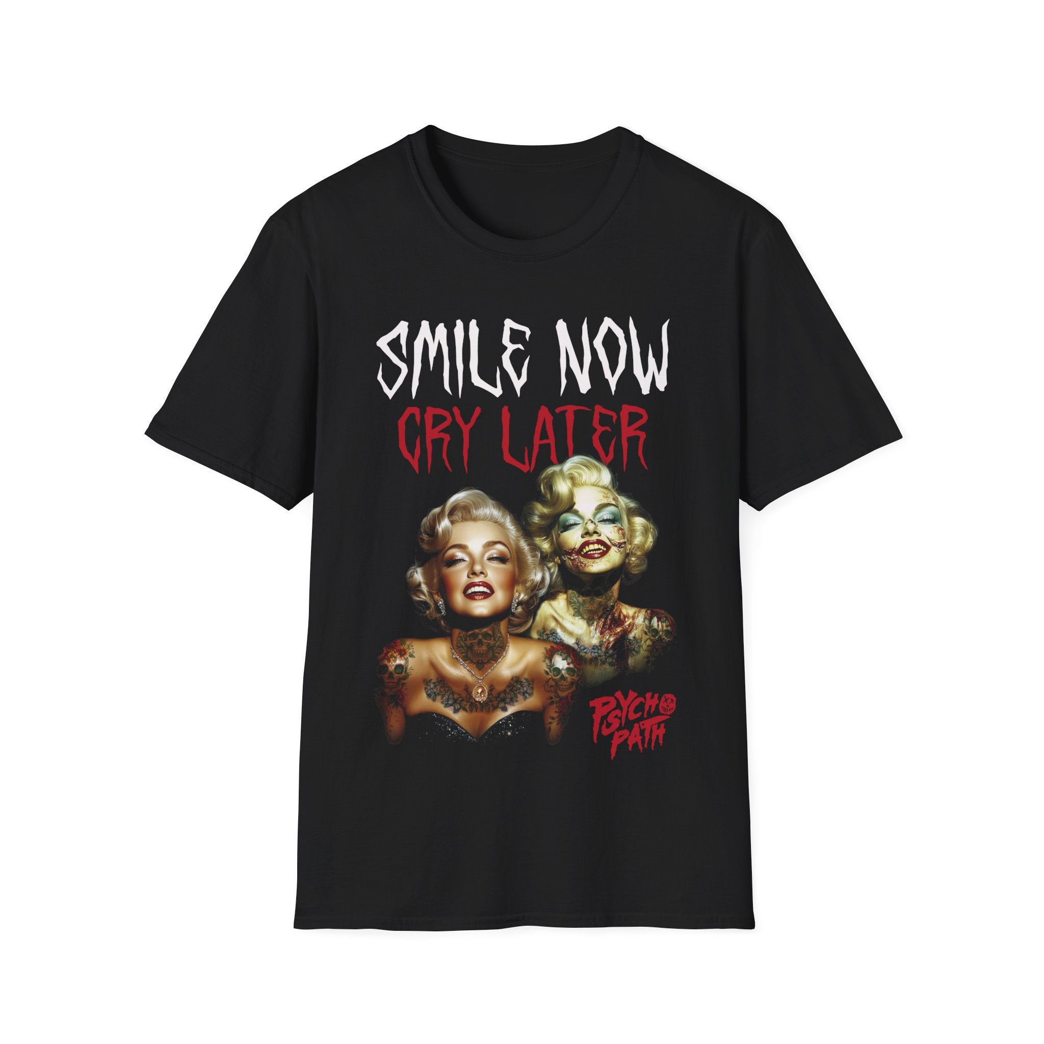 This striking tee features the iconic Marilyn Monroe like you've never seen her before—half radiant starlet, half decaying nightmare. With bold text reading “Smile Now, Cry Later,” it’s a chilling reminder that beauty fades… but horror lasts forever.