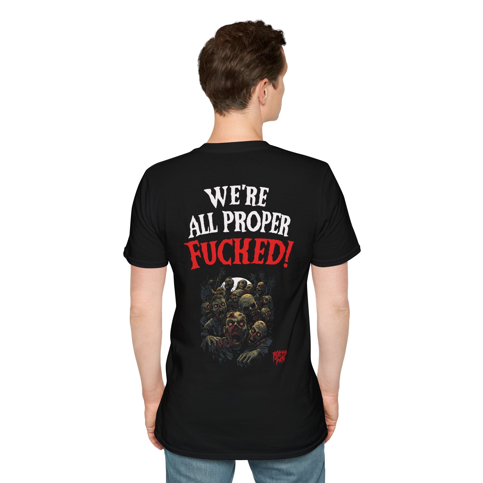This tee doesn’t sugar-coat the end of the world. Featuring a swarm of the undead and the brutally honest truth—“We’re all proper fucked.” Wear it like a warning, or just a vibe check.